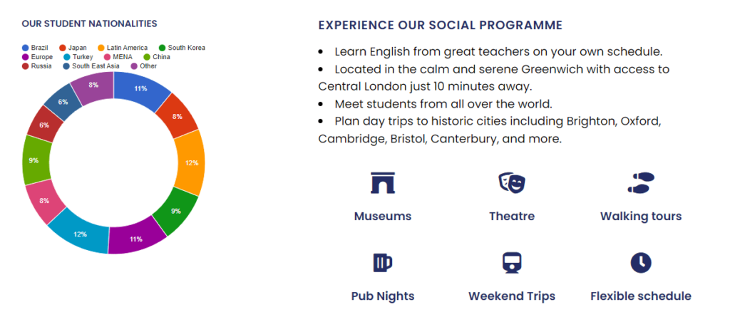 Modern English language school in London is uniquely located in the historic Royal Borough of Greenwich. With central London only a 10 minute train journey away, our students can easily explore the city whilst studying in a beautiful area away from the crowds.